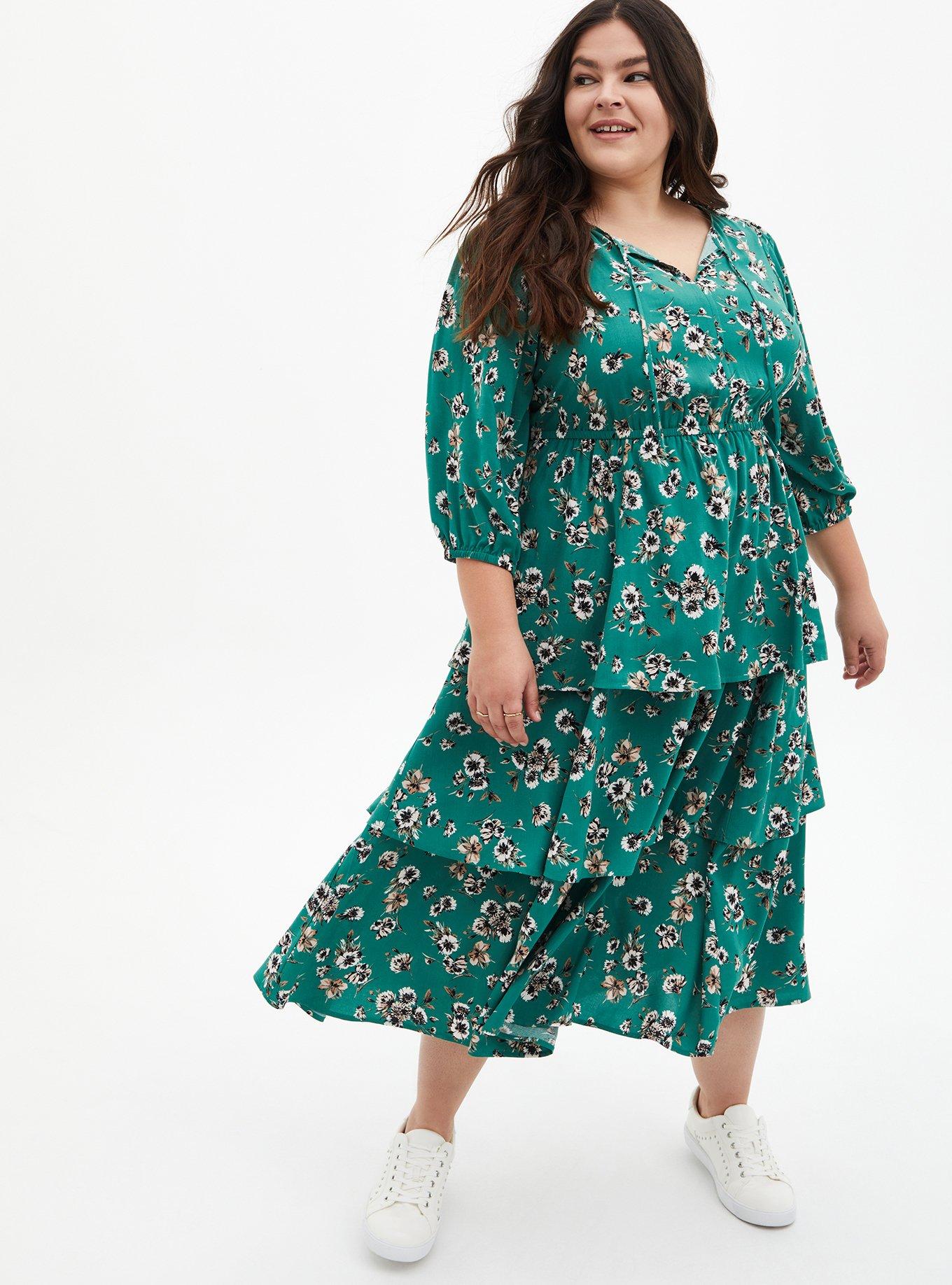 Plus Size Green Floral Challis Tiered Skater Tea Length Dress Torrid Very well made.