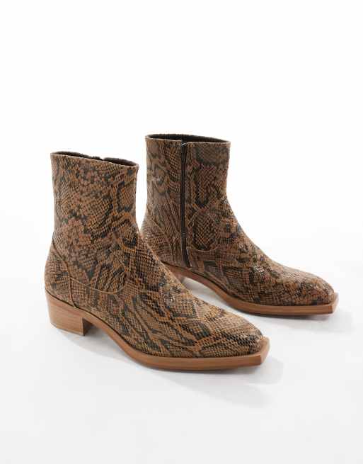 ASOS Design Ria Mid Heel Leather Boots in Natural snake Multi Very well made.