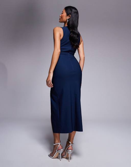 Vesper Square Neck Cut Out Midaxi Dress with Thigh Split in Navy Very well made.
