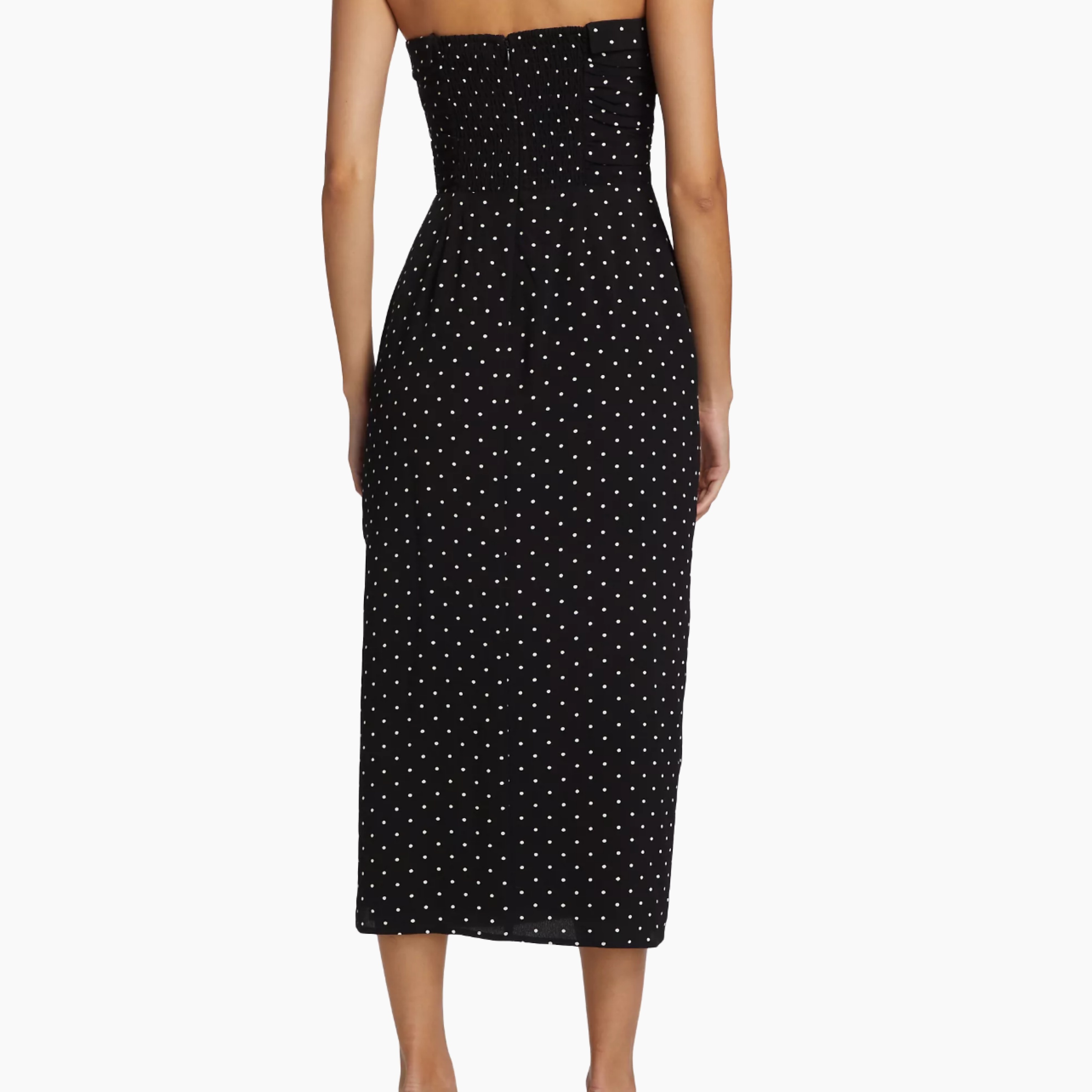 Amazon WAYF Women s Strapless Ruched Midi Dress Black Polka Dot XL Clothing Shoes Jewelry Very well made.
