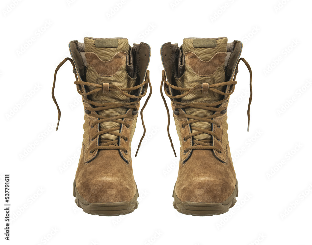 Modern army combat boots. New desert beige shoes. Isolate on a white back. Stock Foto Adobe Stock Very well made.
