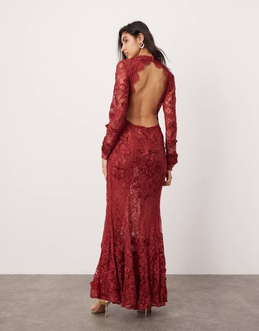 ASOS EDITION Vestito lungo in pizzo bordeaux a maniche lunghe con schiena scoperta e ricamo floreale Very well made.