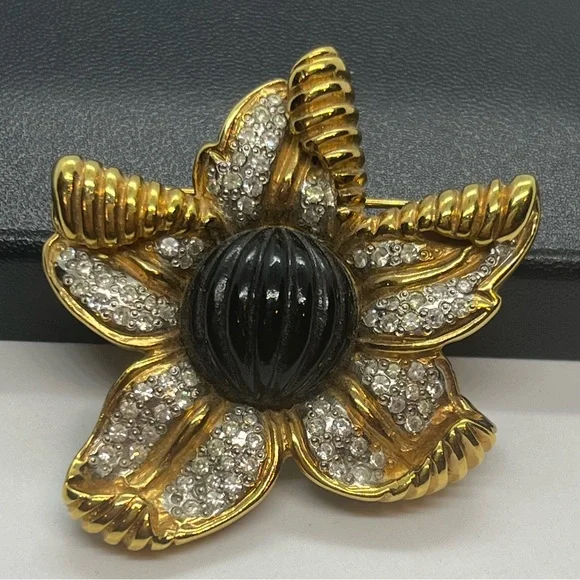 Vogue Bijoux Signed vintage gold rhinestone black cabochon flower brooch pin Jewelry Very well made.