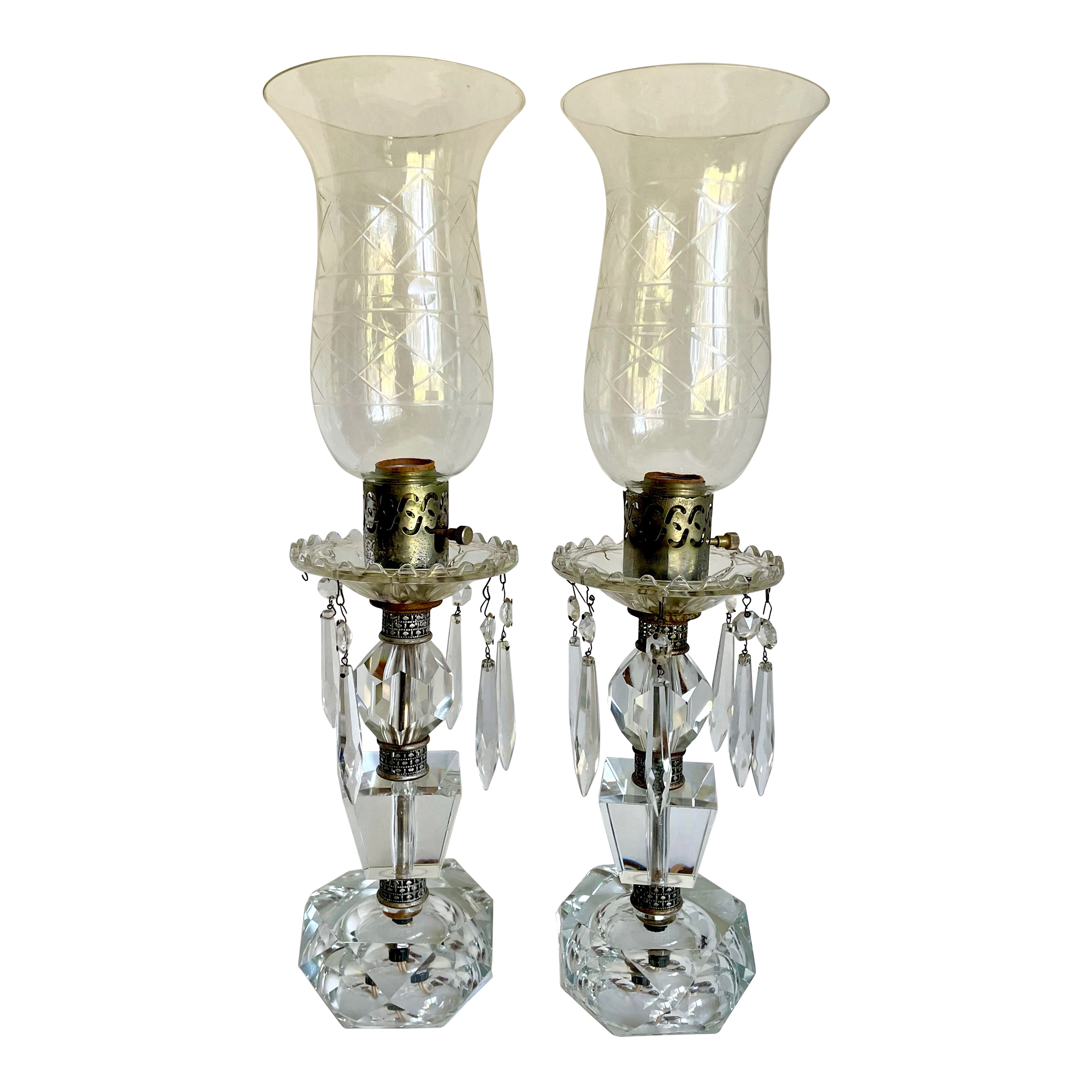 Pair Vintage Crystal Hurricane Lamps with Prisms Very well made.