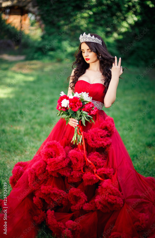 beautiful brunette in a crown with a bouquet in his hand and in a chic big and lush red dress in the park among the green Stock Photo Adobe Stock Very well made.