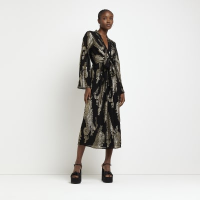 Gold paisley tie front long sleeve midi dress River Island Very well made.
