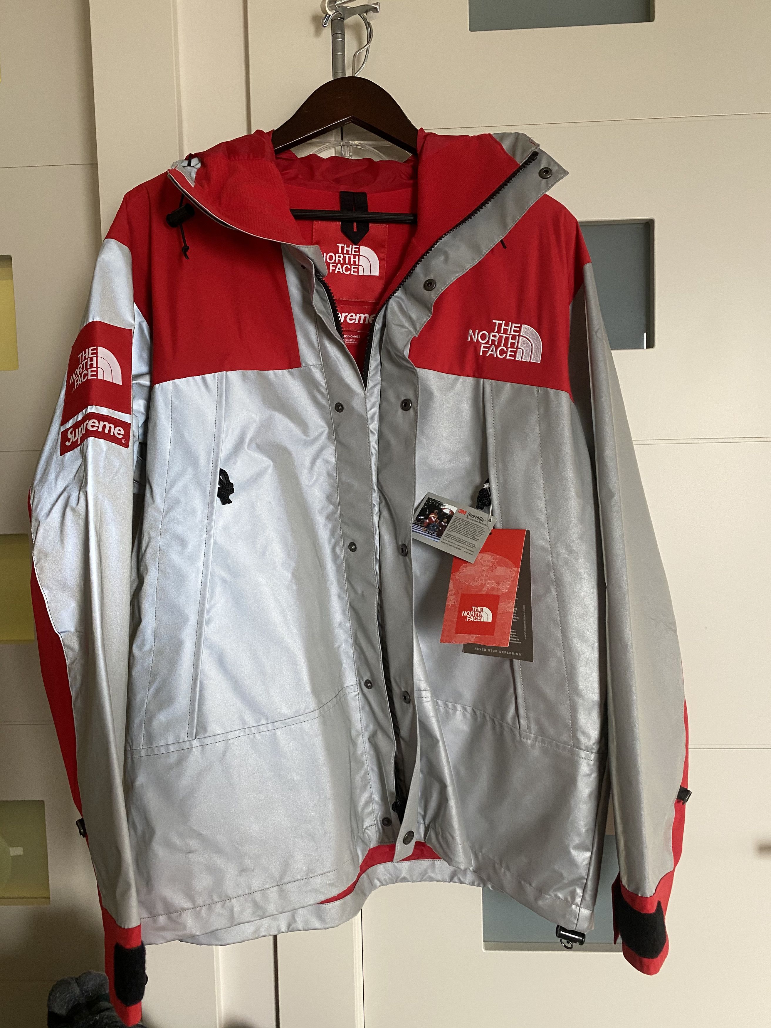 SUPREME X THE NORTH FACE 3M MOUNTAIN PARKA REFLECTIVE SILVER RED JACKET TNF L Very well made.