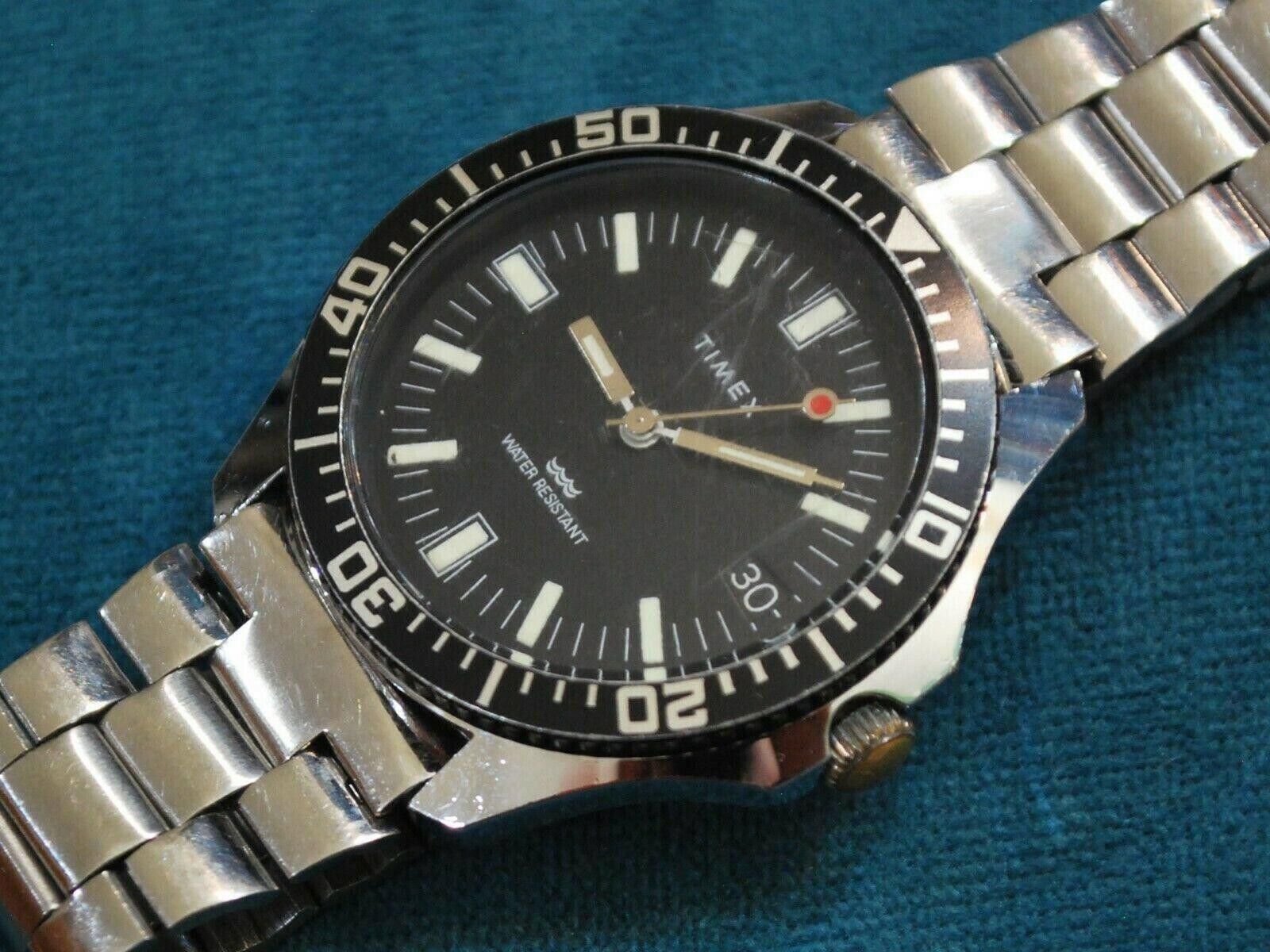 VINTAGE TIMEX 1980s DAY SPORT DIVER BLACK DIAL QUARTZ MEN S SILVER LEATHER WATCH Very well made.