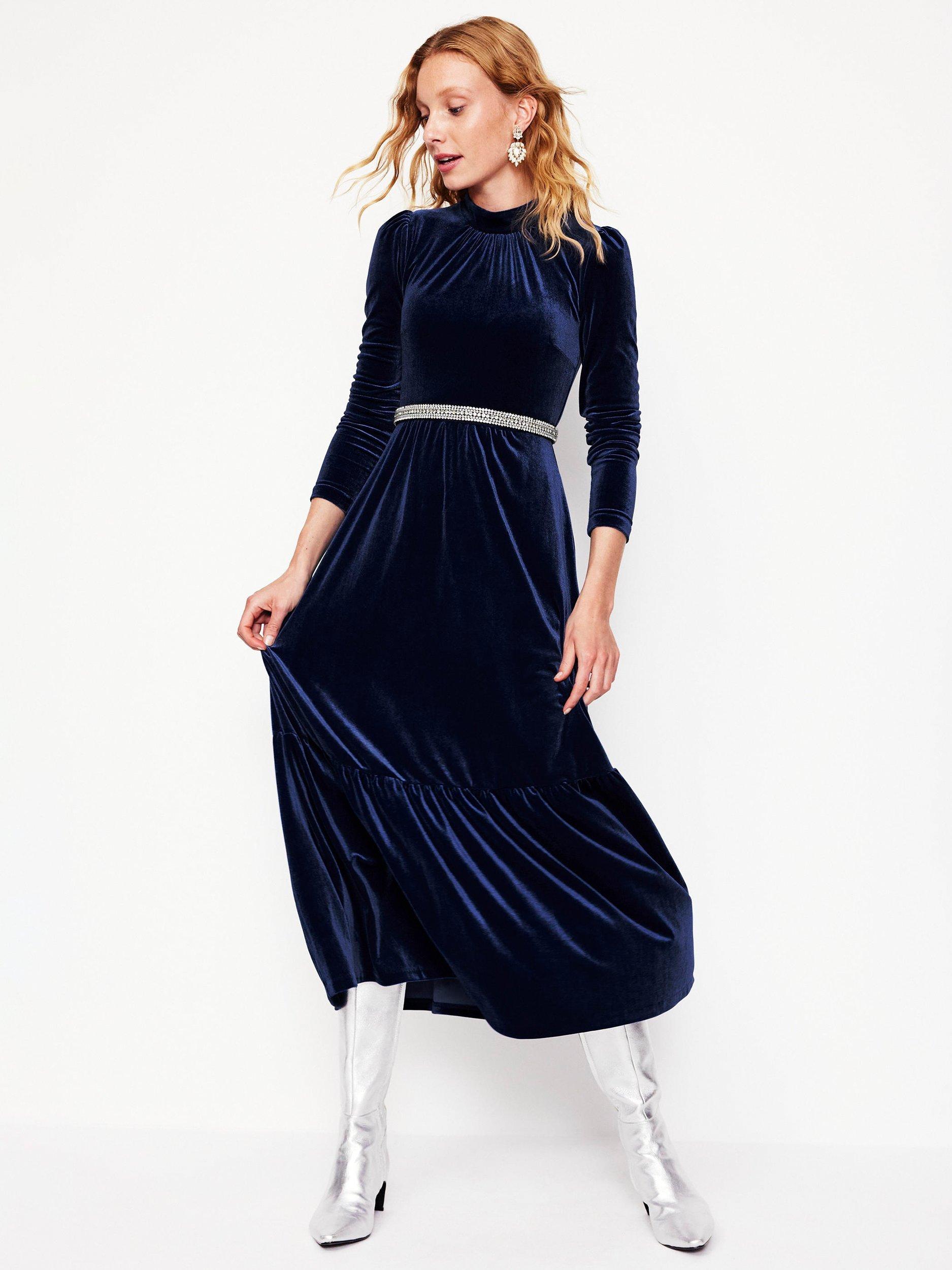 Boden High Neck Tiered Velvet Dress Night Blue Very well made.
