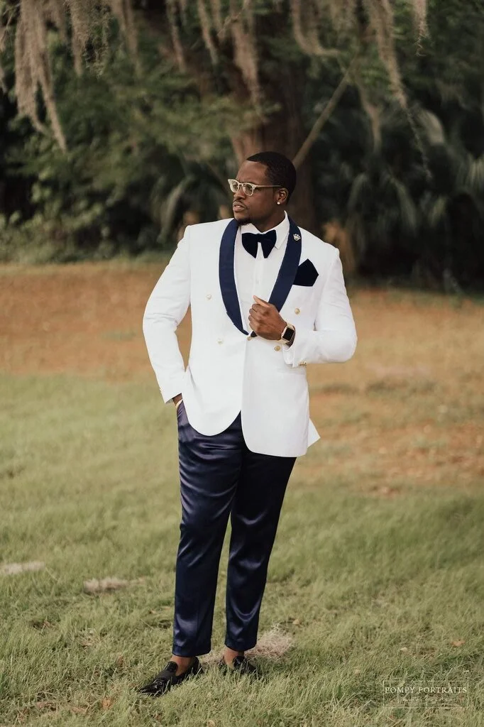 White Tuxedos White and Navy Blue Tuxedo Statementtuxedos Very well made.