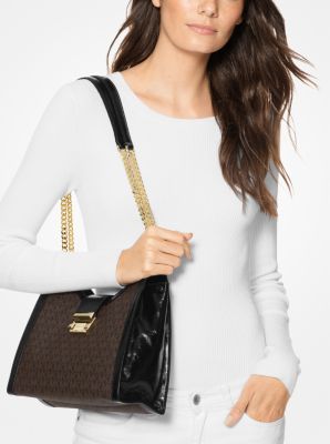 MICHAEL KORS Whitney Small Logo Leather Shoulder Chain Tote Bag Brown Black NEW Very well made.