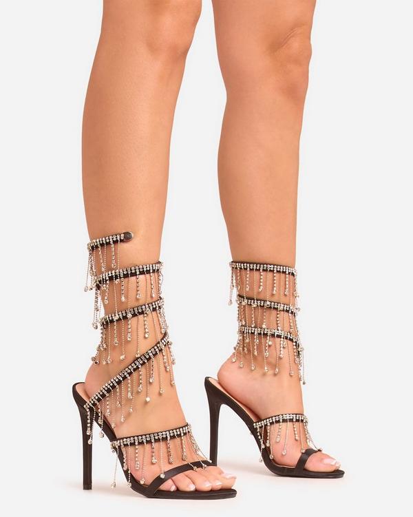 Xander Diamante Tassel Detail Wrap Around Strap Stiletto Heel In Black Satin EGO Very well made.