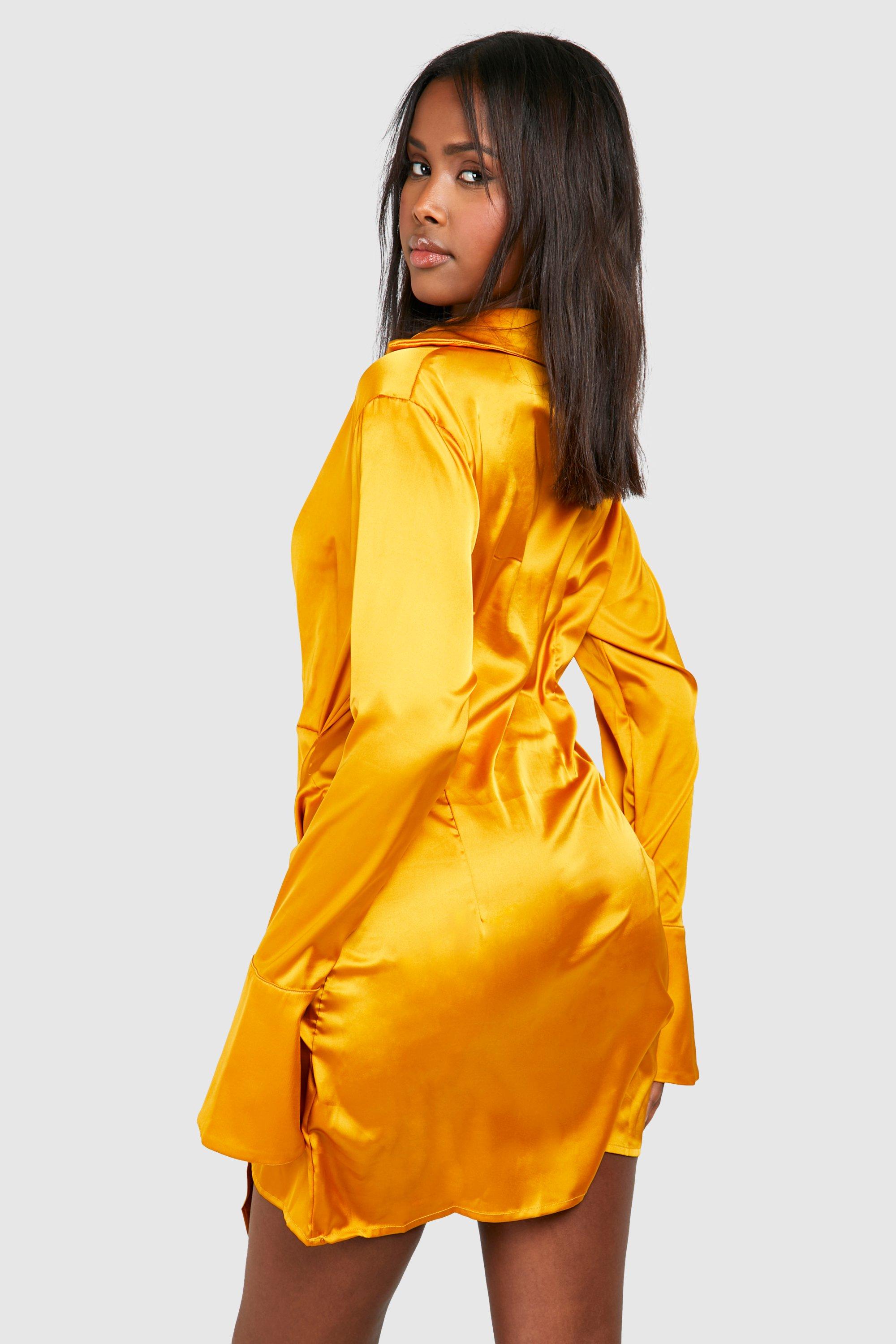 Yellow Hammered Satin Ruched Long Sleeve Shirt Dress Very well made.