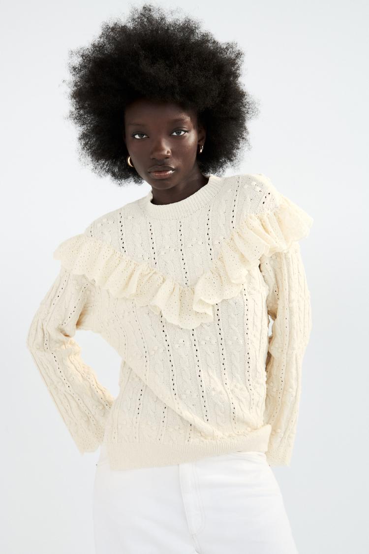 KNIT SWEATER WITH RUFFLE TRIMS Ecru ZARA Spain Very well made.