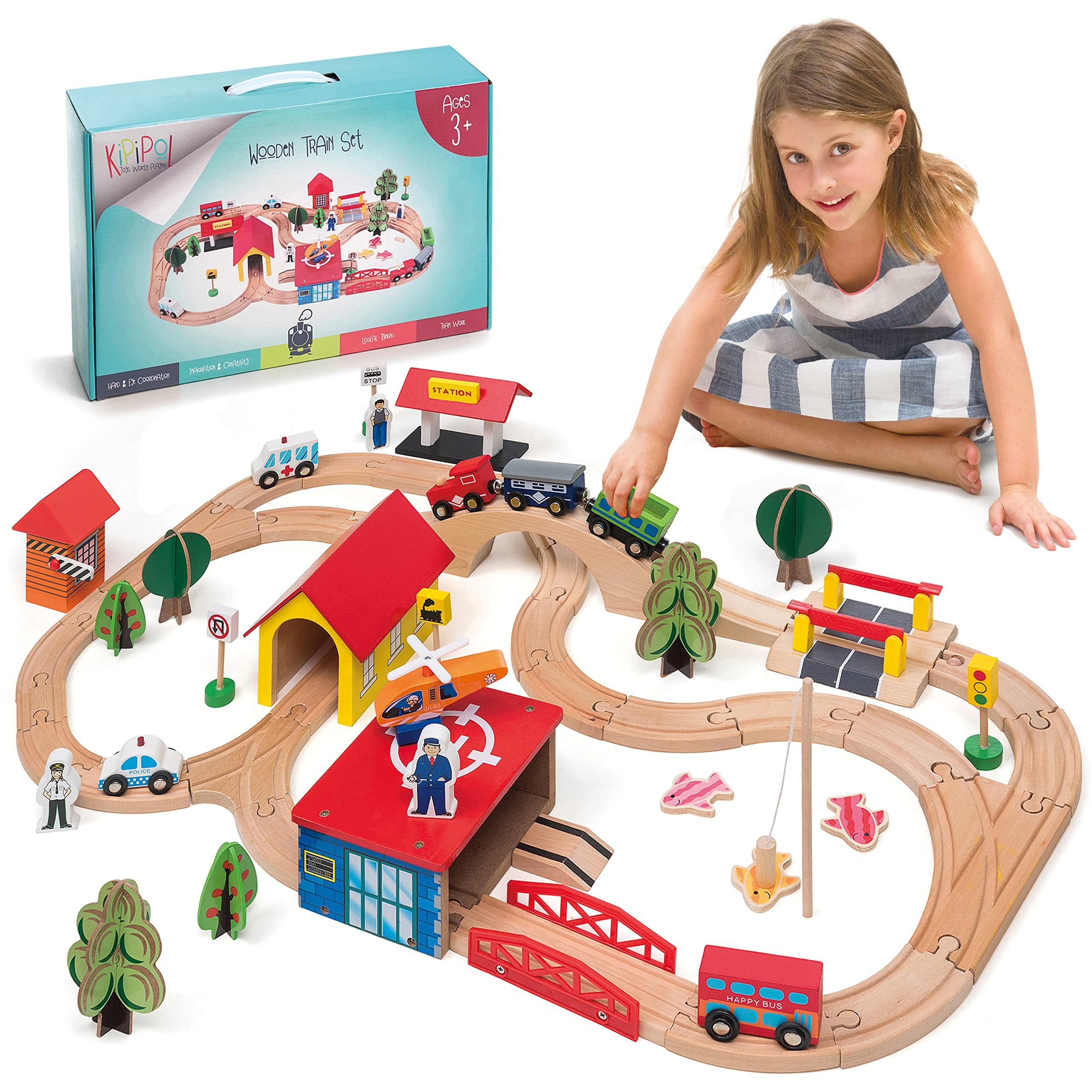 KipiPol Wooden Train Set 69 Pieces Wooden Train Tracks Trains for Kids Toddler Boys and Girls 3 4 5 Years Old and Up Premium Wood Construction Toys Fits Thomas Brio IKEA Melissa and Doug Very well made.