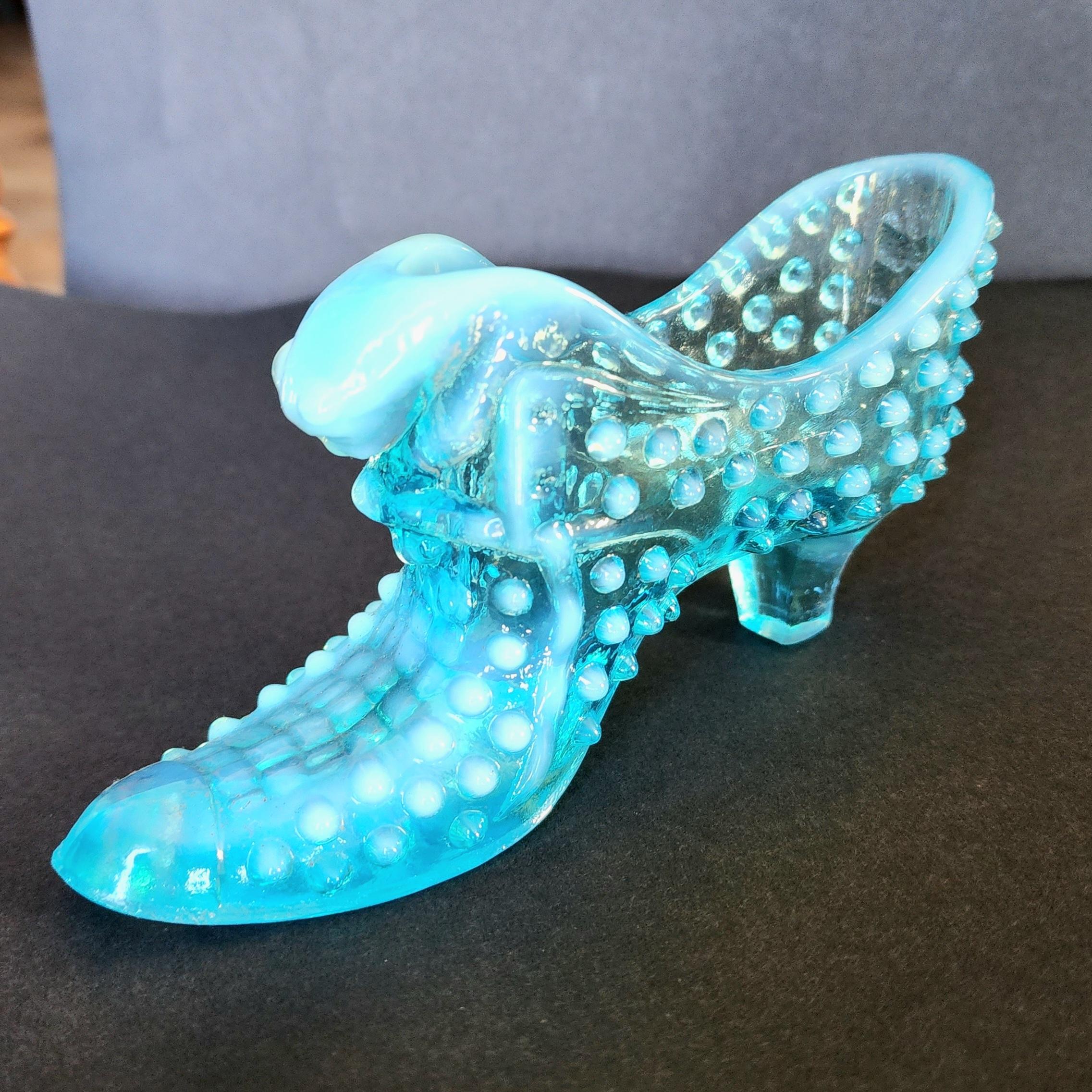 Vintage Fenton Hobnail Cat Head Art Glass Slipper Shoe Turquoise Aqua Opalescent Chairish Very well made.