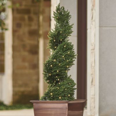 Set of 2 Lighted Pre Potted 4 Foot Artificial Cedar Topiary Outdoor Indoor Trees Set of 2 Battery Operated with Timers Very well made.