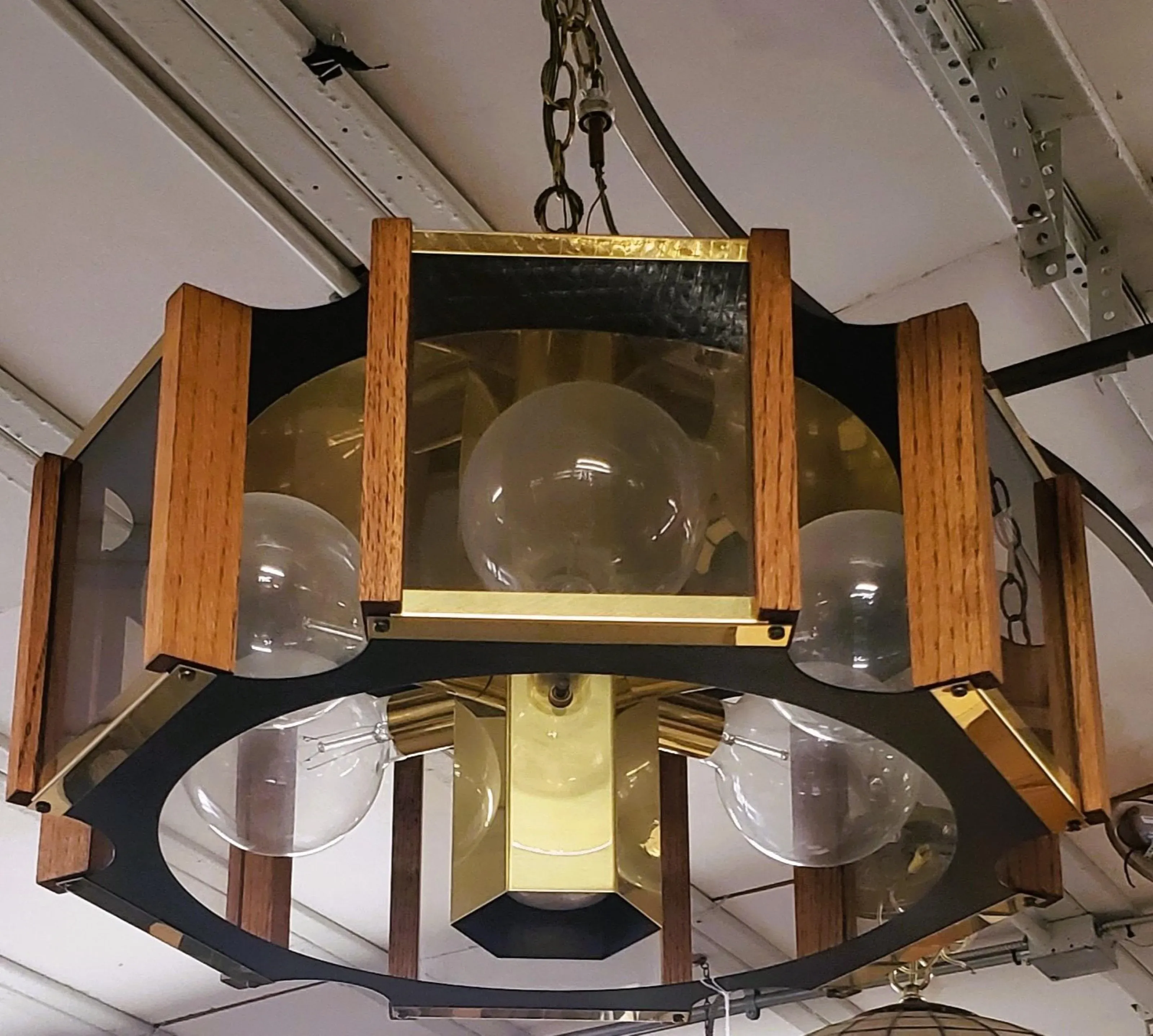 1970s Fredrick Ramond Hexagonal Brass Oak Wood Smoke Glass Chandelier Chairish Very well made.