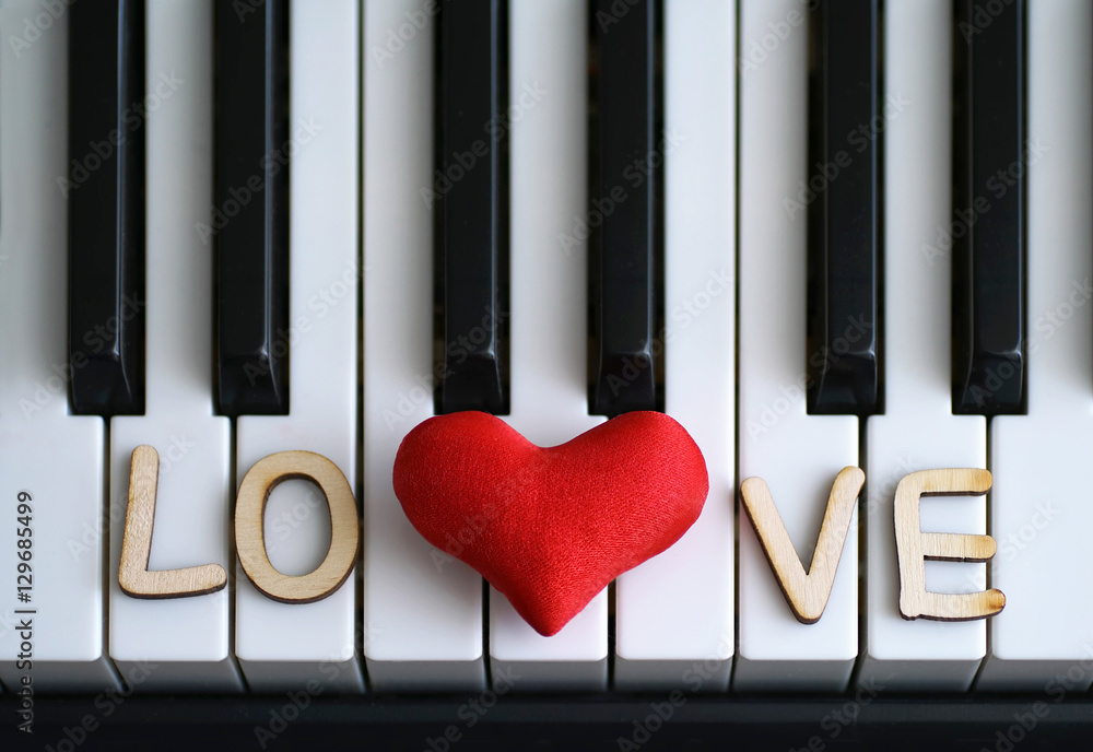 Piano keys closeup with the letters love and the heart. The idea of the concept for composer concert musical inspiration love of music. The original art image with valentine. Stock Photo Very well made.