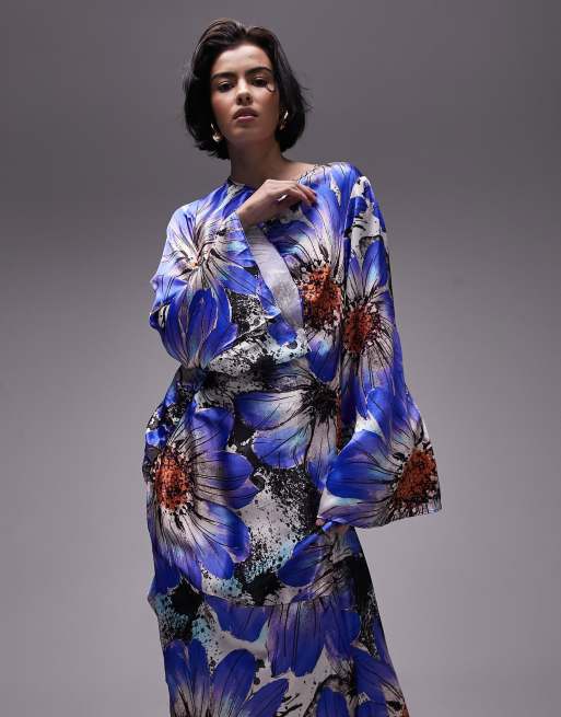 Topshop bold floral ruched long sleeve midi dress in cobalt ASOS Very well made.