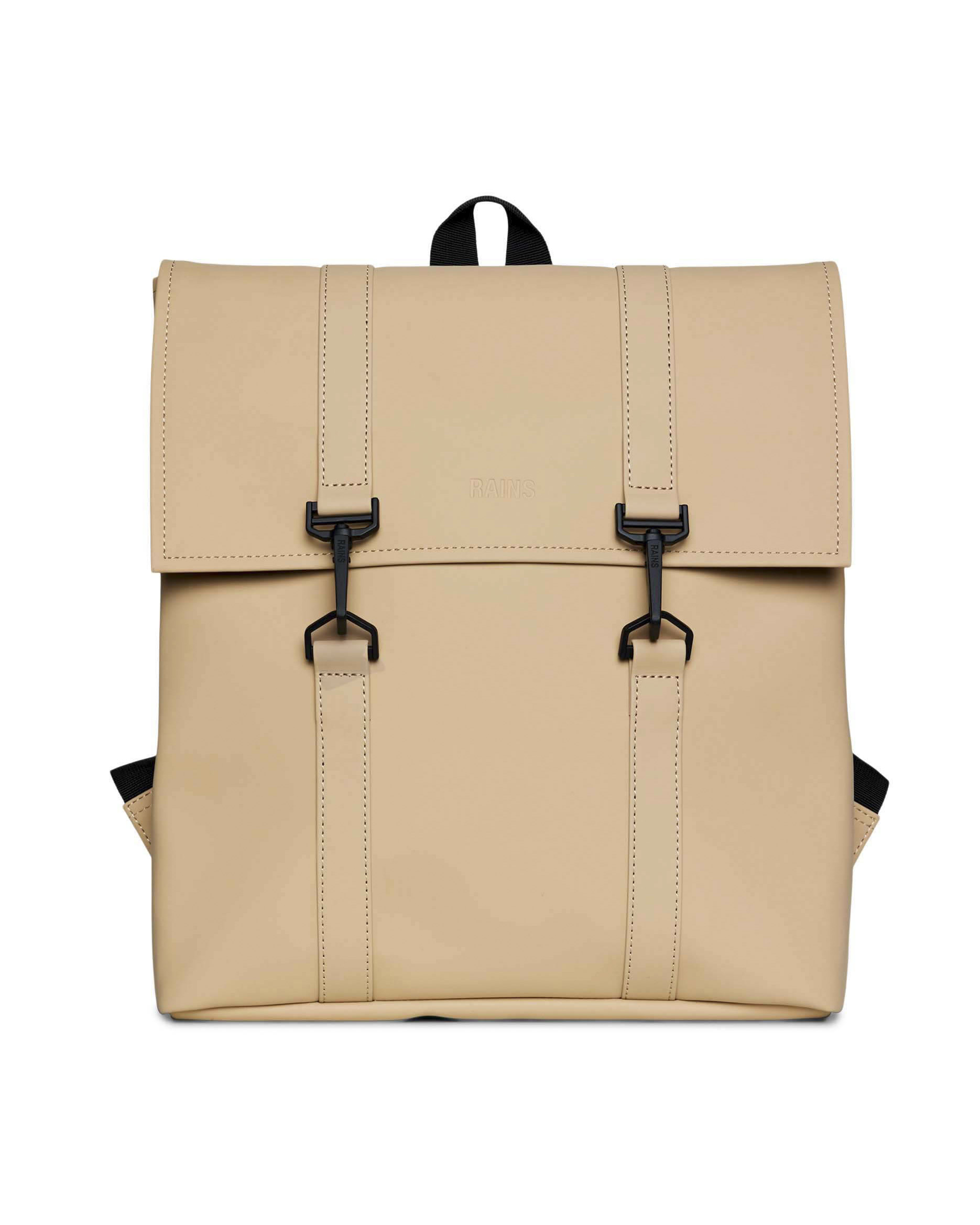 Zaino Msn Bag Mini color cammello in tessuto tecnico impermeabile effetto gommato con doppia chiusura a cartella e moschettoni Very well made.